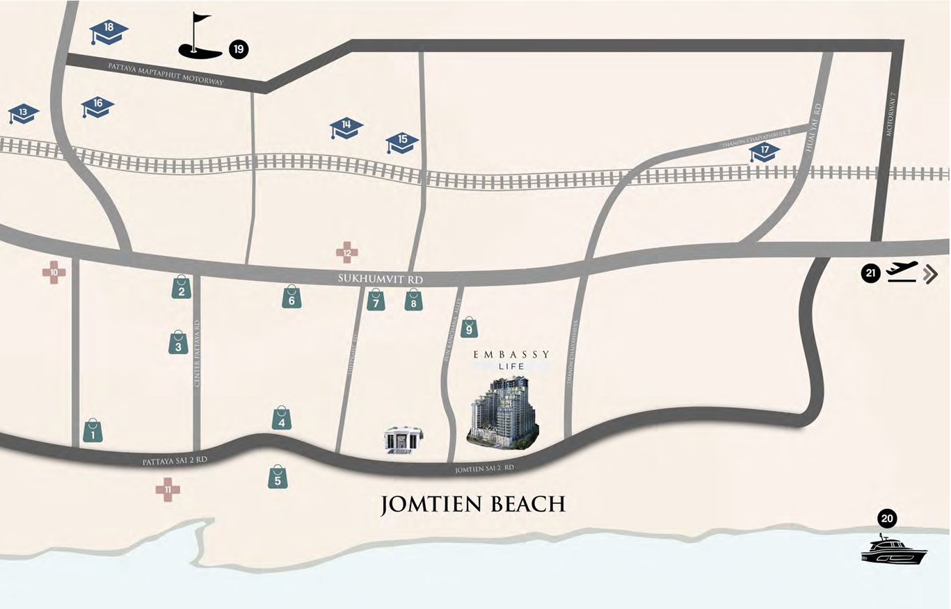 - Convenience & Connectivity: Jomtien offers easy access to local markets, shopping, services, and Pattaya’s city amenities — making Embassy Life a great choice whether you want tranquility or city convenience.